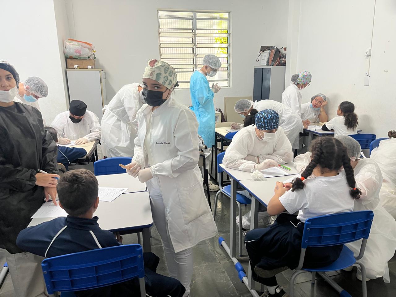 No encerramento, as crianças receberam kits de higiene bucal, com escova e fio dental, e participaram de uma atividade prática de escovação supervisionada.