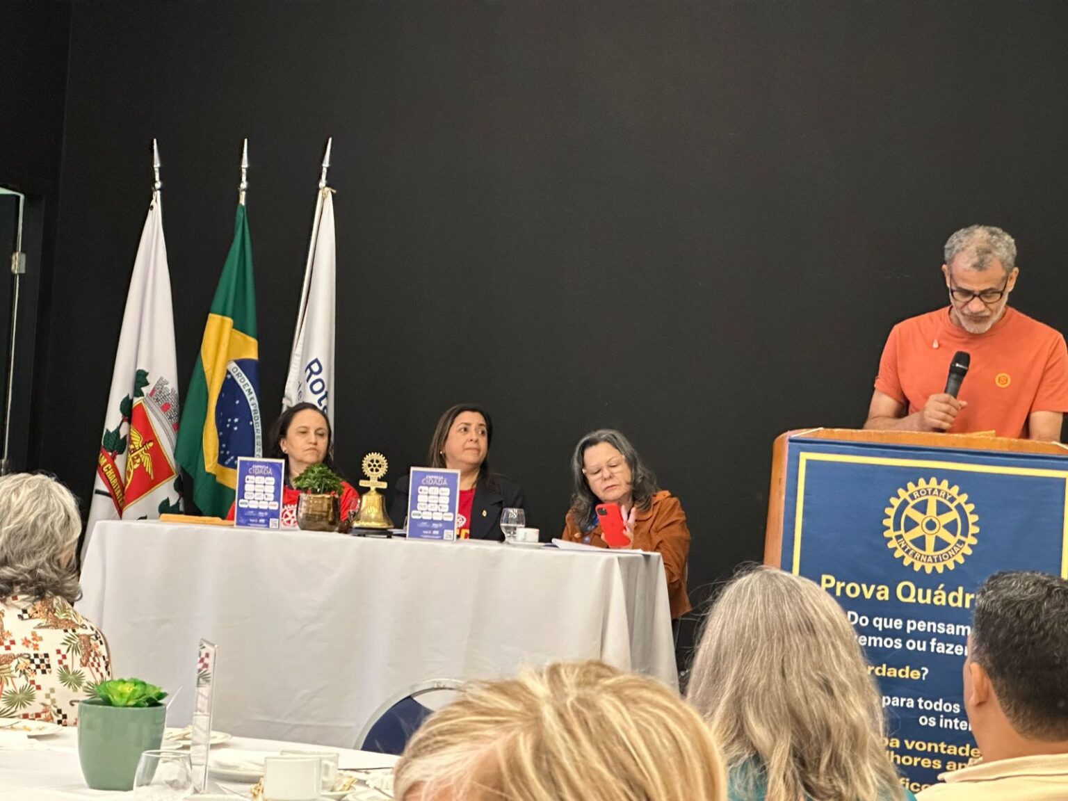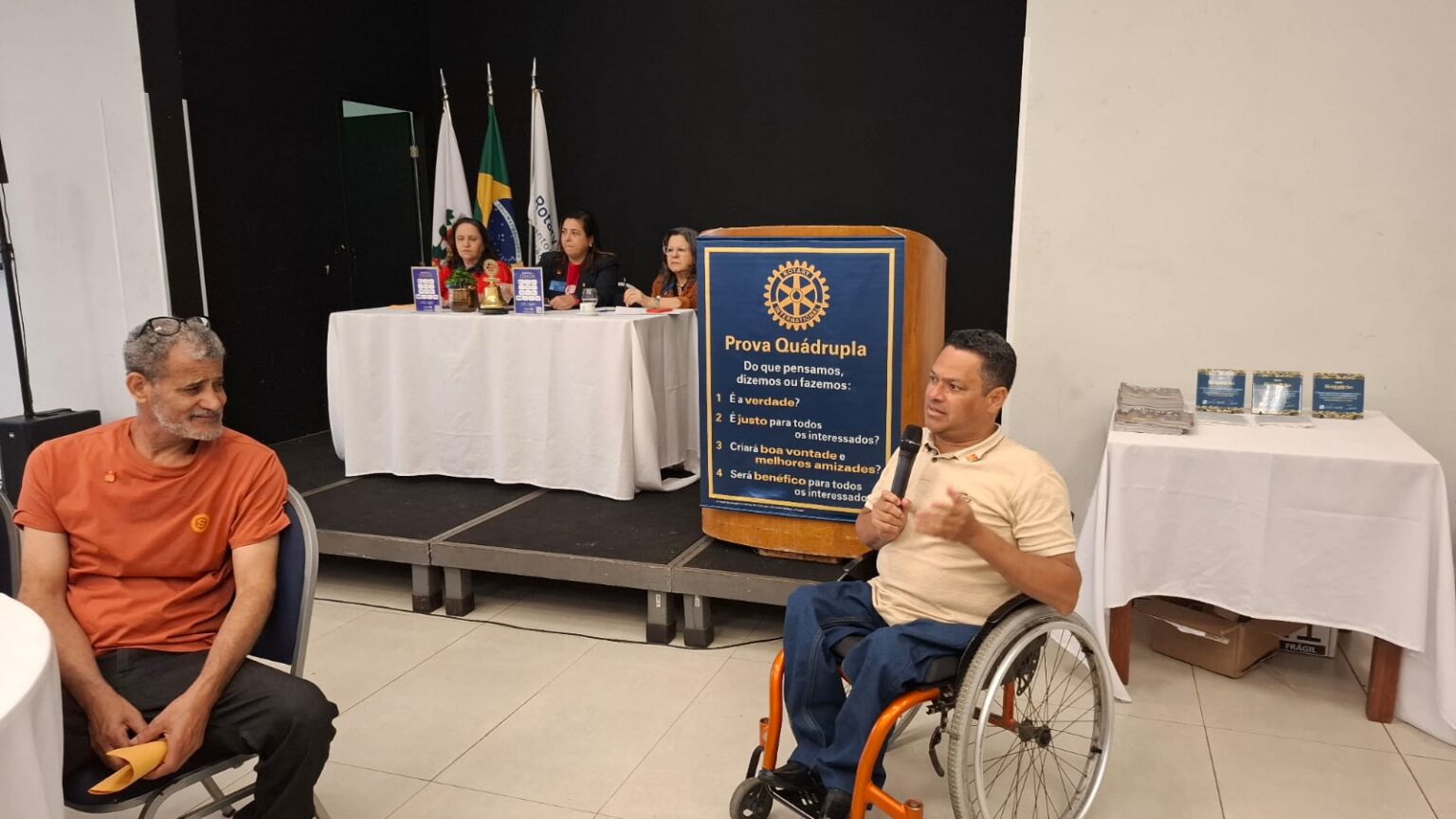 Em seguida, tivemos uma verdadeira lição de amor, superação e emoção. O torneiro mecânico, Carlos Gonçalves e o funcionário público hoje aposentado, Gibson Ferreira Dias, relataram suas trajetórias de vida desde que contraíram a Poliomielite, ainda na infância. … Viveram momentos difíceis, mas sempre tiveram o apoio da família e amigos. Carlos ficou um tempo com paralisia, mas após vários tratamentos e muita fé de sua mãe, voltou a andar com dificuldade, enfrentou adversidades, e hoje veio compartilhar tudo isto com a gente. Já Gibson, ficou paralítico após contrair a doença…e nunca voltou a andar…durante sua vida, recebeu o apoio da Casa da Esperança, mantida pelo Rotary Club de Santos e tem muita gratidão por tudo que viveu e aprendeu por lá. “O Rotary fez muita diferença em minha vida, com esse trabalho maravilhoso”, desabafou Gibson, que foi em frente como para-atleta e presidiu uma ONG que cuida de pessoas com necessidades especiais. Segundo Carlos e Gibson “nenhuma criança merece passar pelo que eles passaram, pois apesar de todo apoio, fica um trauma”. Gibson e Carlos nos deram uma verdadeira lição de vida e apesar de tudo que enfrentaram, se consideram vencedores!!!! End Polio Now!