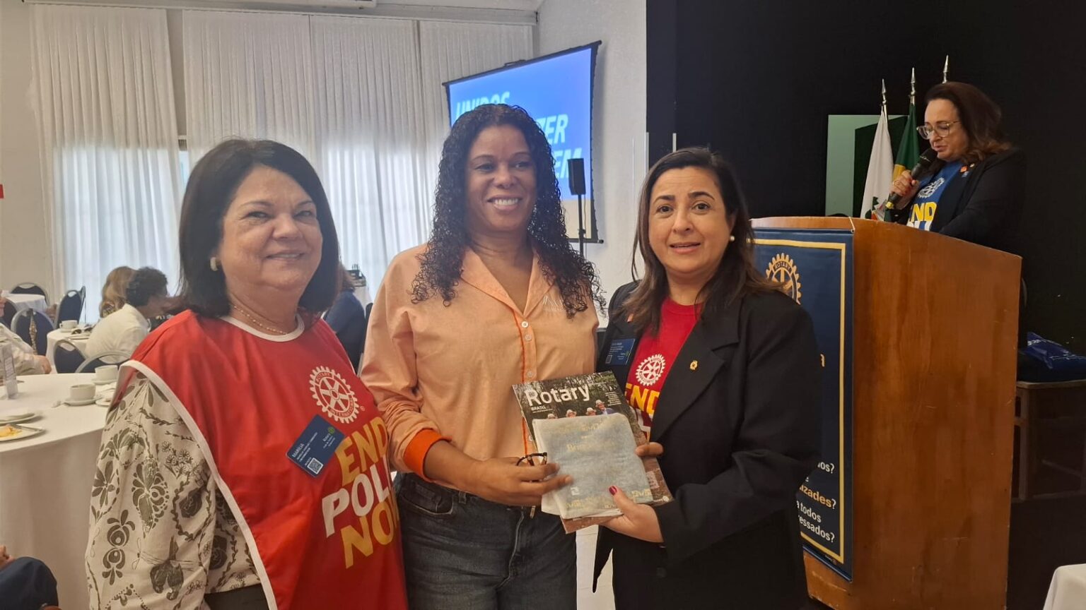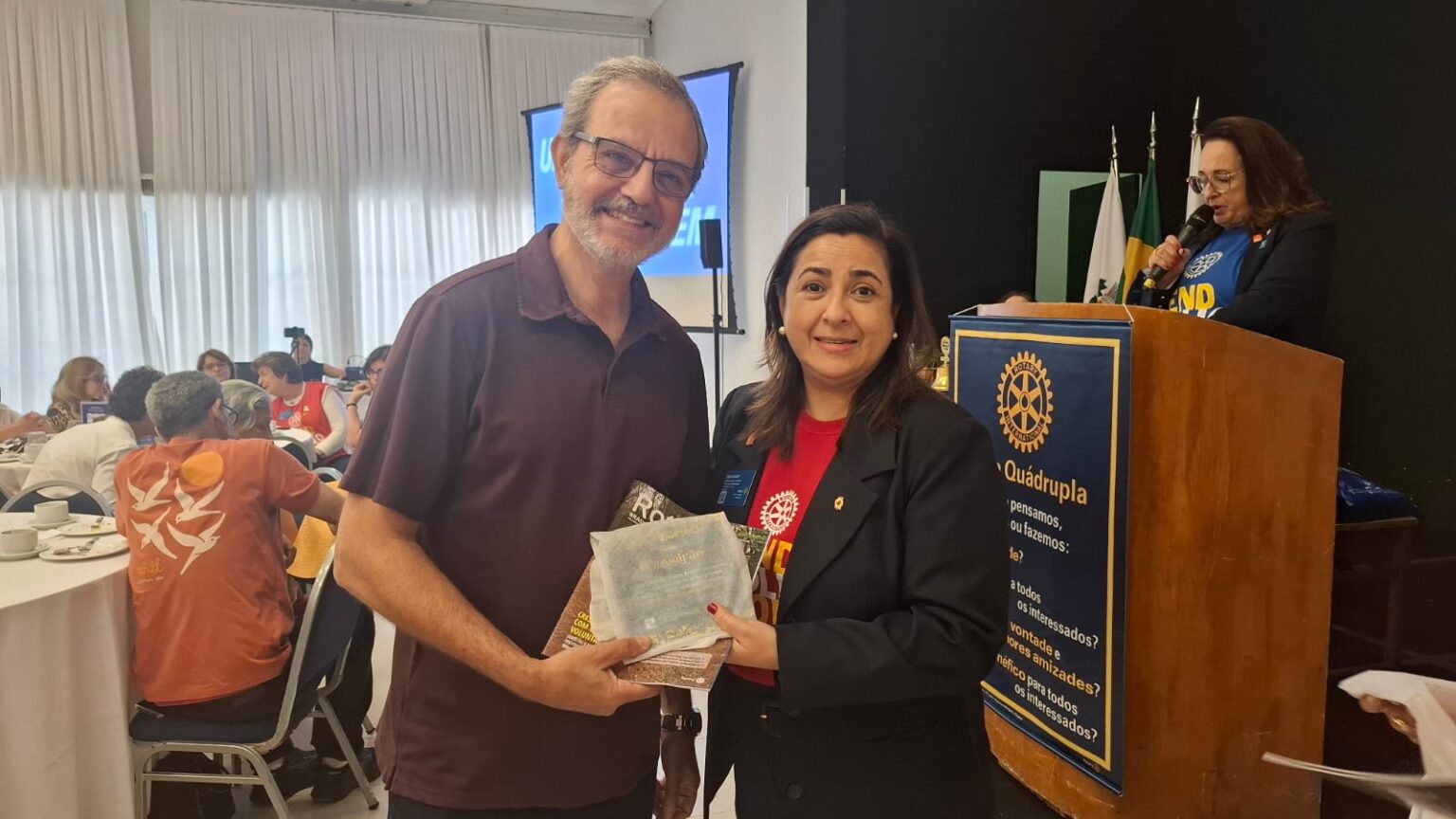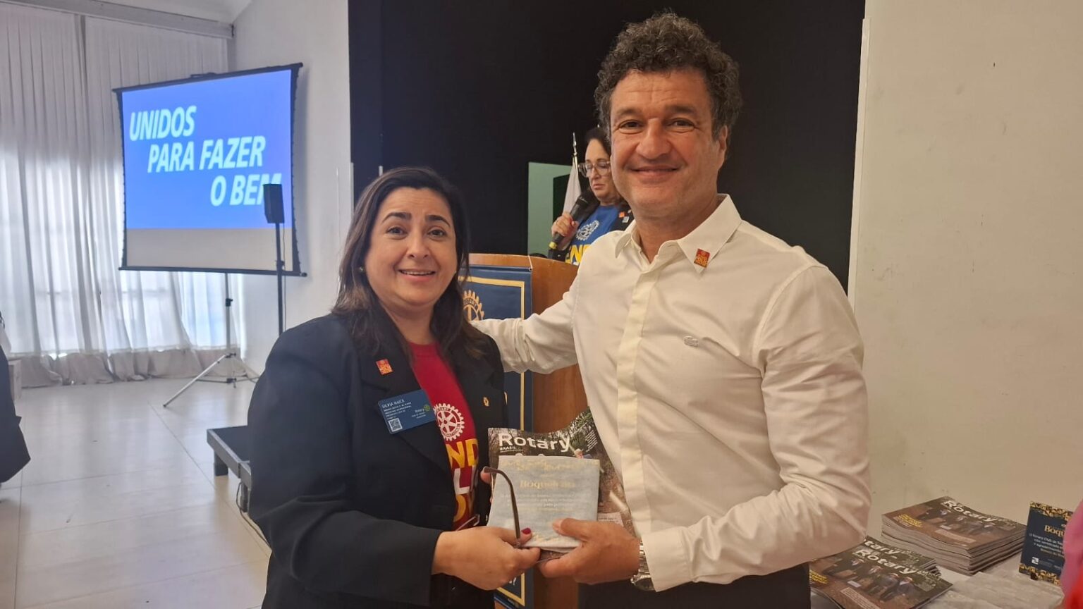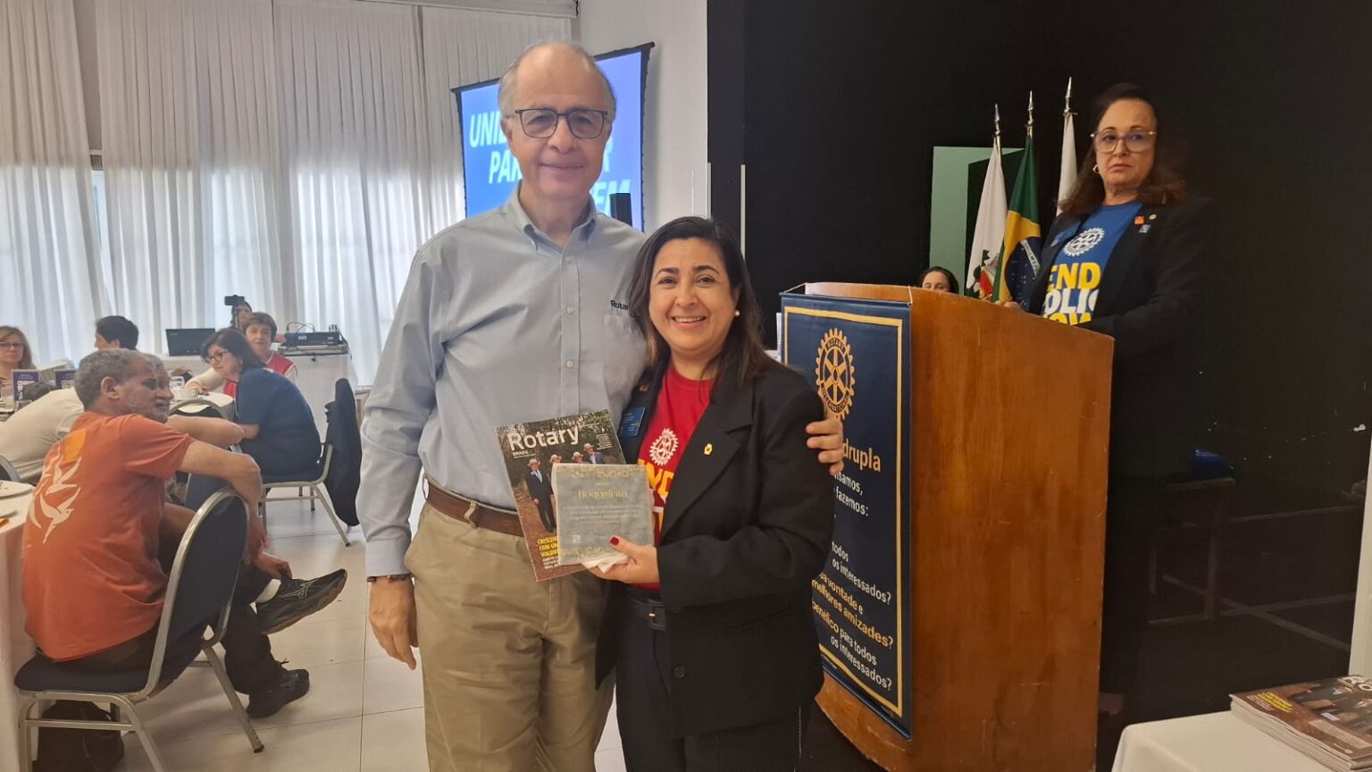 Em seguida, tivemos uma verdadeira lição de amor, superação e emoção. O torneiro mecânico, Carlos Gonçalves e o funcionário público hoje aposentado, Gibson Ferreira Dias, relataram suas trajetórias de vida desde que contraíram a Poliomielite, ainda na infância. … Viveram momentos difíceis, mas sempre tiveram o apoio da família e amigos. Carlos ficou um tempo com paralisia, mas após vários tratamentos e muita fé de sua mãe, voltou a andar com dificuldade, enfrentou adversidades, e hoje veio compartilhar tudo isto com a gente. Já Gibson, ficou paralítico após contrair a doença…e nunca voltou a andar…durante sua vida, recebeu o apoio da Casa da Esperança, mantida pelo Rotary Club de Santos e tem muita gratidão por tudo que viveu e aprendeu por lá. “O Rotary fez muita diferença em minha vida, com esse trabalho maravilhoso”, desabafou Gibson, que foi em frente como para-atleta e presidiu uma ONG que cuida de pessoas com necessidades especiais. Segundo Carlos e Gibson “nenhuma criança merece passar pelo que eles passaram, pois apesar de todo apoio, fica um trauma”. Gibson e Carlos nos deram uma verdadeira lição de vida e apesar de tudo que enfrentaram, se consideram vencedores!!!! End Polio Now!
