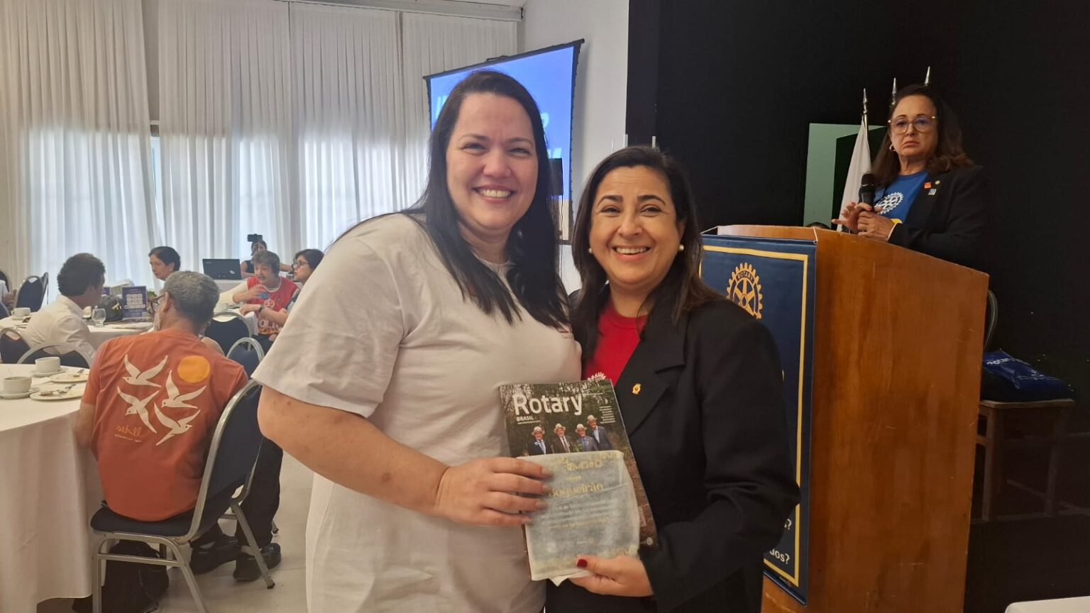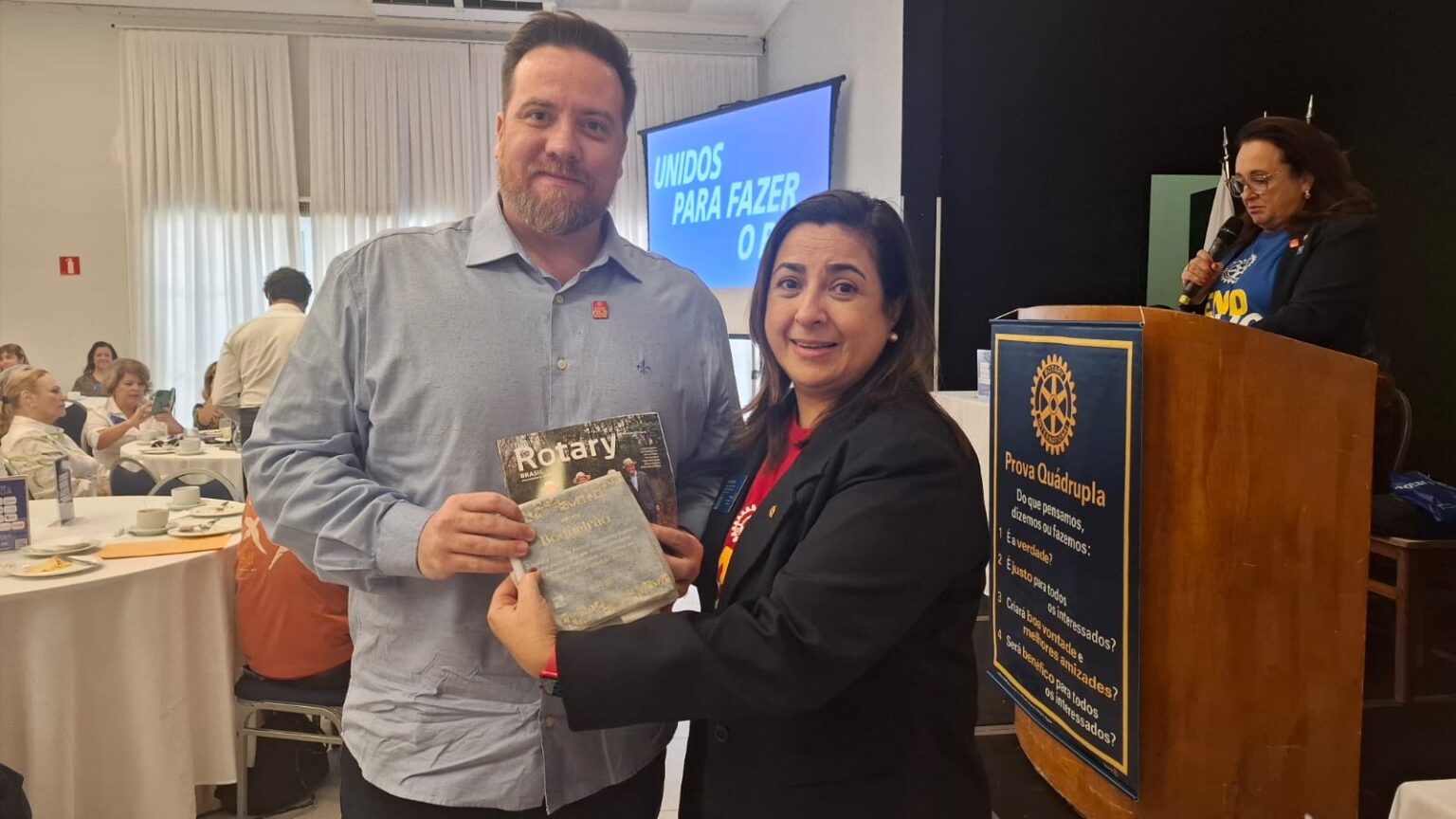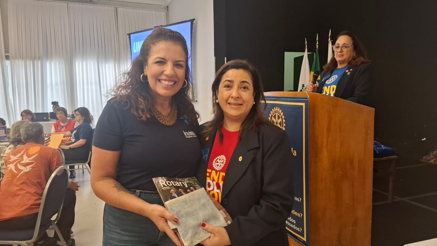 Em seguida, tivemos uma verdadeira lição de amor, superação e emoção. O torneiro mecânico, Carlos Gonçalves e o funcionário público hoje aposentado, Gibson Ferreira Dias, relataram suas trajetórias de vida desde que contraíram a Poliomielite, ainda na infância. … Viveram momentos difíceis, mas sempre tiveram o apoio da família e amigos. Carlos ficou um tempo com paralisia, mas após vários tratamentos e muita fé de sua mãe, voltou a andar com dificuldade, enfrentou adversidades, e hoje veio compartilhar tudo isto com a gente. Já Gibson, ficou paralítico após contrair a doença…e nunca voltou a andar…durante sua vida, recebeu o apoio da Casa da Esperança, mantida pelo Rotary Club de Santos e tem muita gratidão por tudo que viveu e aprendeu por lá. “O Rotary fez muita diferença em minha vida, com esse trabalho maravilhoso”, desabafou Gibson, que foi em frente como para-atleta e presidiu uma ONG que cuida de pessoas com necessidades especiais. Segundo Carlos e Gibson “nenhuma criança merece passar pelo que eles passaram, pois apesar de todo apoio, fica um trauma”. Gibson e Carlos nos deram uma verdadeira lição de vida e apesar de tudo que enfrentaram, se consideram vencedores!!!! End Polio Now!
