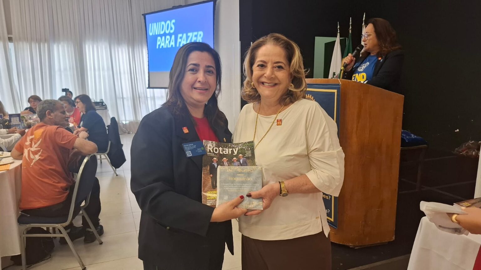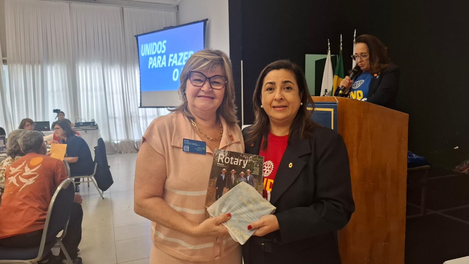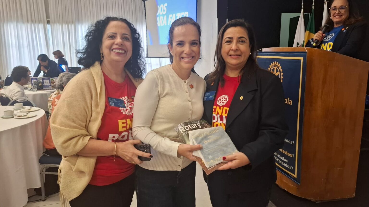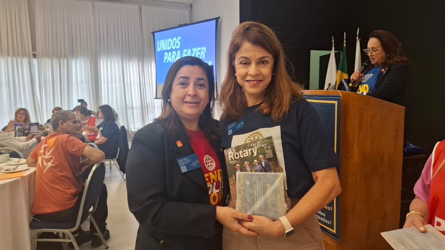 Em seguida, tivemos uma verdadeira lição de amor, superação e emoção. O torneiro mecânico, Carlos Gonçalves e o funcionário público hoje aposentado, Gibson Ferreira Dias, relataram suas trajetórias de vida desde que contraíram a Poliomielite, ainda na infância. … Viveram momentos difíceis, mas sempre tiveram o apoio da família e amigos. Carlos ficou um tempo com paralisia, mas após vários tratamentos e muita fé de sua mãe, voltou a andar com dificuldade, enfrentou adversidades, e hoje veio compartilhar tudo isto com a gente. Já Gibson, ficou paralítico após contrair a doença…e nunca voltou a andar…durante sua vida, recebeu o apoio da Casa da Esperança, mantida pelo Rotary Club de Santos e tem muita gratidão por tudo que viveu e aprendeu por lá. “O Rotary fez muita diferença em minha vida, com esse trabalho maravilhoso”, desabafou Gibson, que foi em frente como para-atleta e presidiu uma ONG que cuida de pessoas com necessidades especiais. Segundo Carlos e Gibson “nenhuma criança merece passar pelo que eles passaram, pois apesar de todo apoio, fica um trauma”. Gibson e Carlos nos deram uma verdadeira lição de vida e apesar de tudo que enfrentaram, se consideram vencedores!!!! End Polio Now!